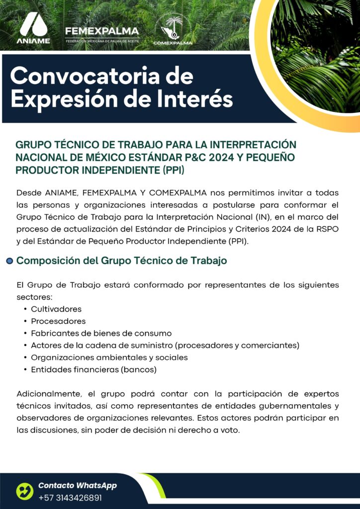 Esta nueva convocatoria detalla el proceso de postulación para conformar el Grupo Técnico de Trabajo (GTT) encargado de la Interpretación Nacional (IN) de México bajo los estándares RSPO 2024 y PPI.